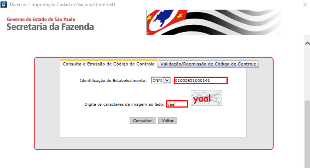 Com o CNPJ preenchido, digite os caracteres da imagem e clique em CONSULTAR para importar;