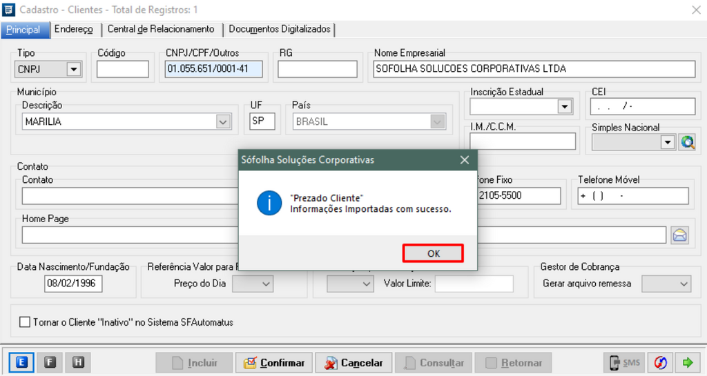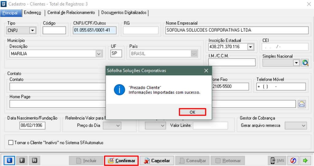 7. Após o carregamento das informações ao aparecer a mensagem em tela, clique em OK e em seguida CONFIRMAR para finalizar o cadastro.