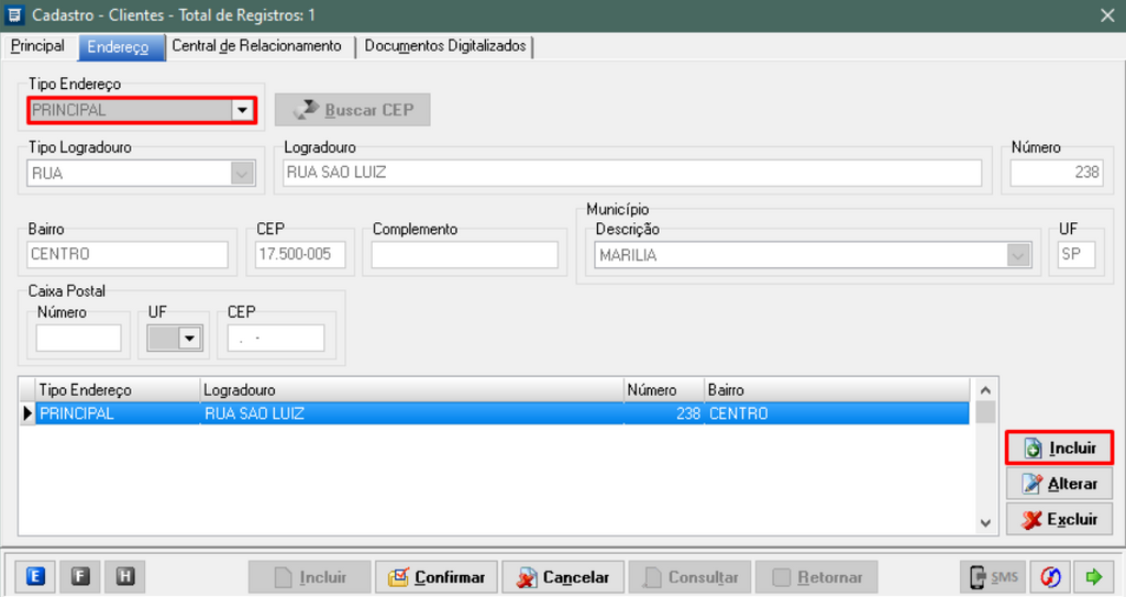 8. Na aba ENDEREÇO ao lado direito da tela clique em INCLUIR, selecione no campo tipo de endereço a opção PRINCIPAL e preencha os dados do endereço do cliente.