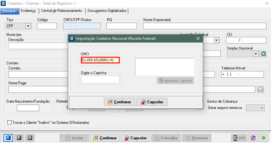 4. Caso o tipo de cadastro for CNPJ, o sistema permite a importação dos dados diretamente da base da Receita Federal