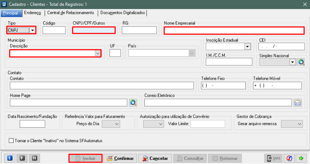 3. Preencha os dados do “Cliente” inserindo obrigatoriamente CNPJ/CPF, Nome Empresarial e Município.