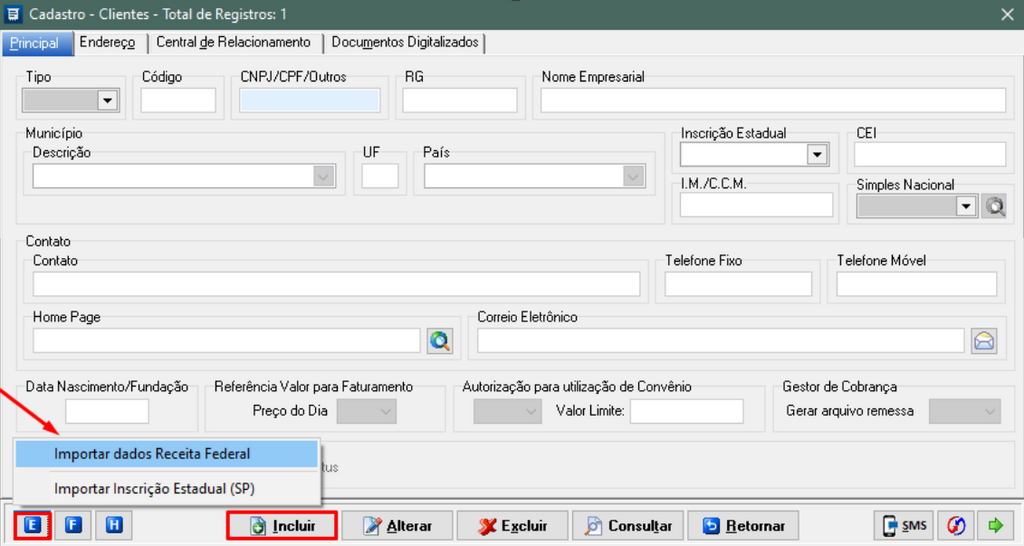Após clicar em INCLUIR, clique sobre o ícone E selecionando a opção Importar Dados da Receita Federal;