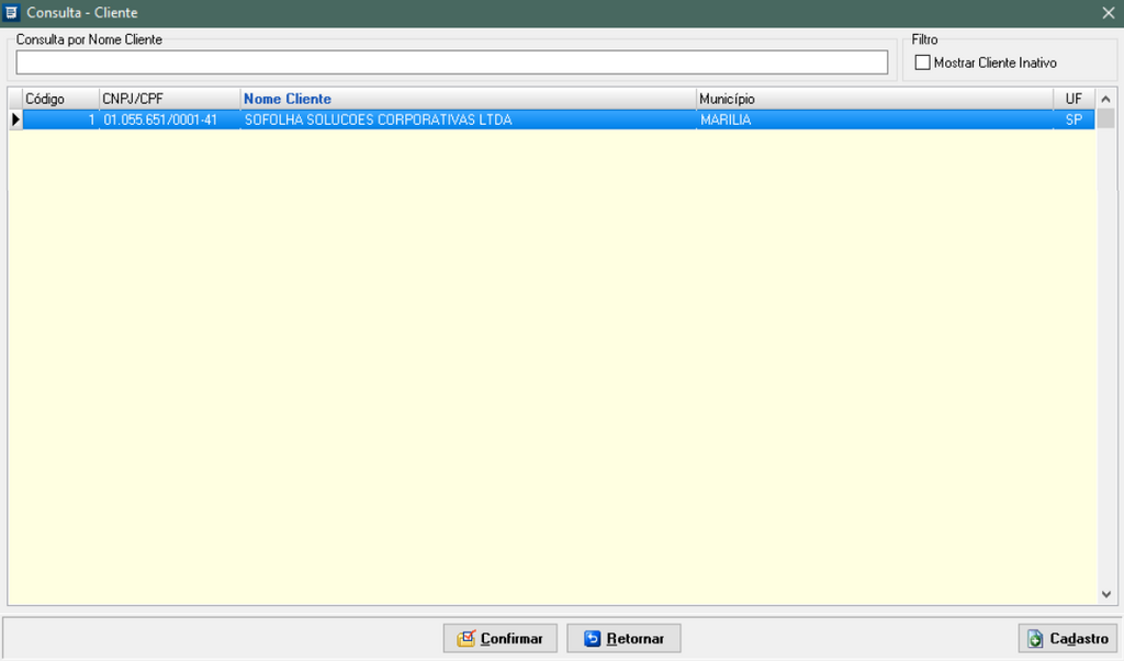 Em seguida, pressione a tecla ENTER para exibir toda a relação de clientes ou informe o nome do cliente no campo de pesquisa e, em seguida, pressione a tecla ENTER.