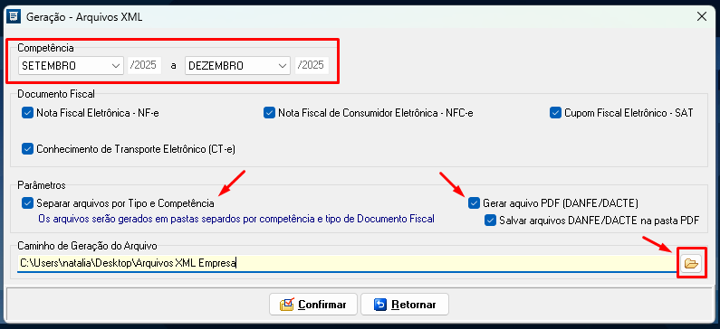 Em Parâmetros, indique se deseja que os arquivos sejam gerados em pastas separadas por competência e tipo de arquivo (caso seja marcado mais de uma opção em tipo de arquivo e selecionada mais de uma competência);