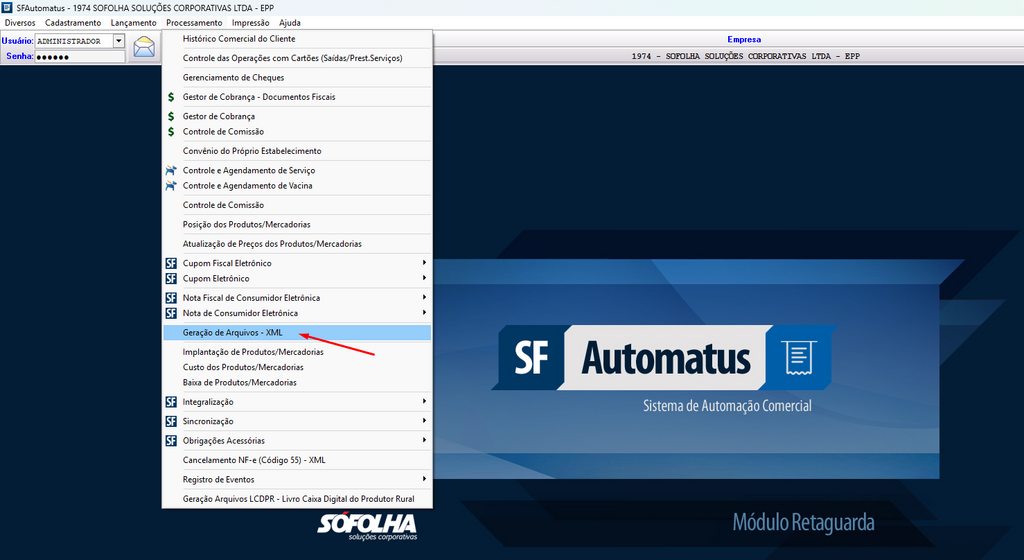 1. Na tela principal do sistema acesse o seguinte caminho: PROCESSAMENTO > GERAÇÃO DE ARQUIVOS - XML