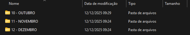 Será apresentada a(s) pasta(s), conforme parametrizado anteriormente. No exemplo acima foi informado nos Parâmetros a opção para "separar arquivos por Tipo e Competência" .