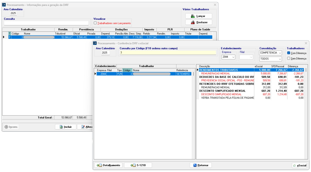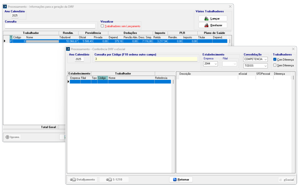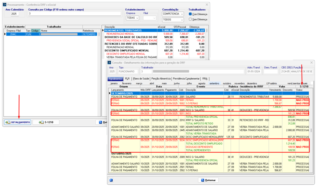 Na tela Processamento → Conferência DIRF x eSocial, ao clicar no botão “Detalhamento”, é possível verificar que: