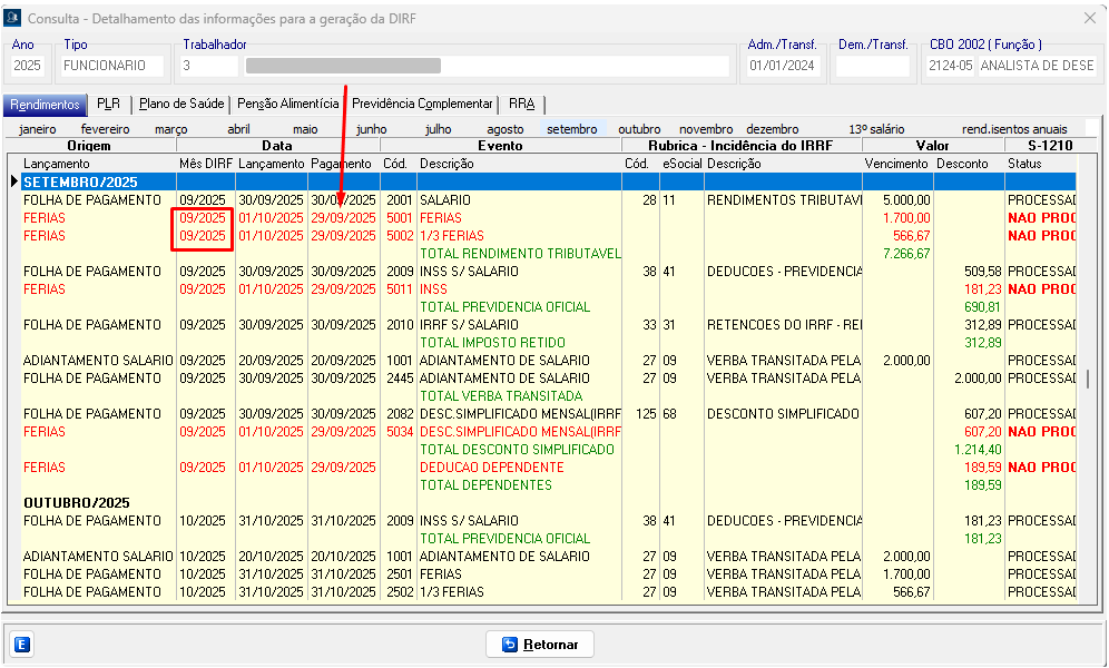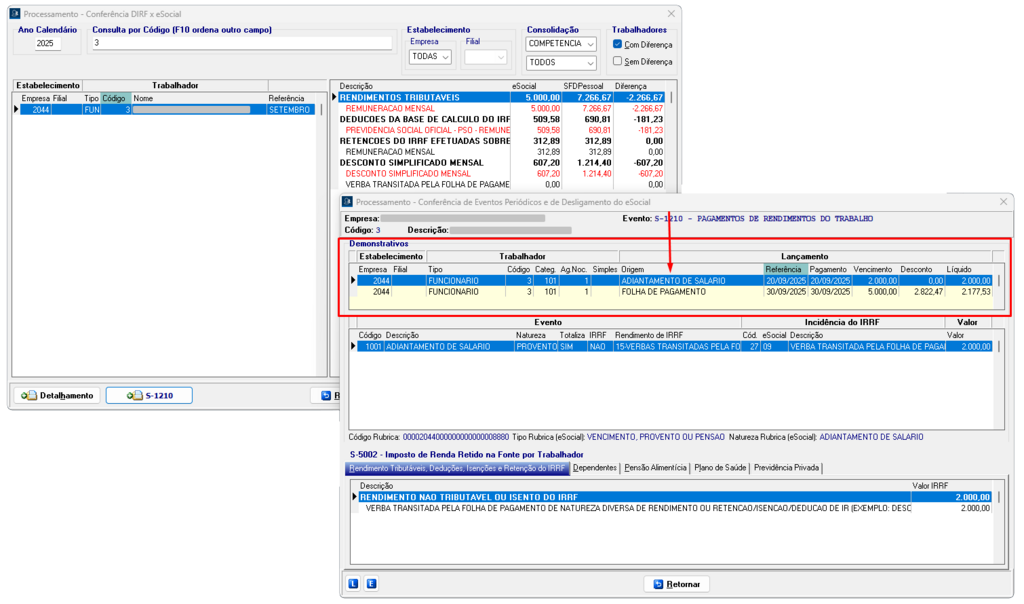 Se o lançamento foi realizado somente em 05/10/2025, e o S-1200 de setembro já havia sido processado em 03/10/2025, o demonstrativo não será enviado ao eSocial na competência correta — gerando diferença na DIRF.