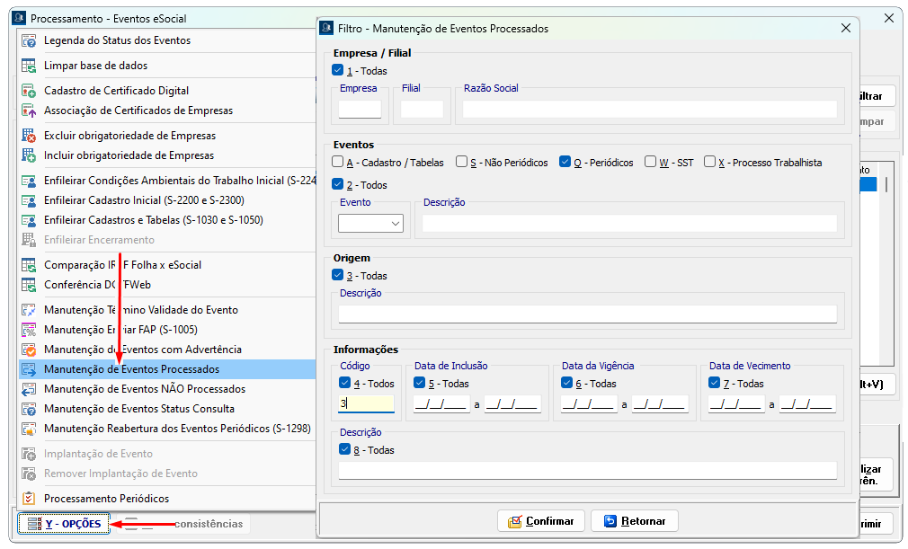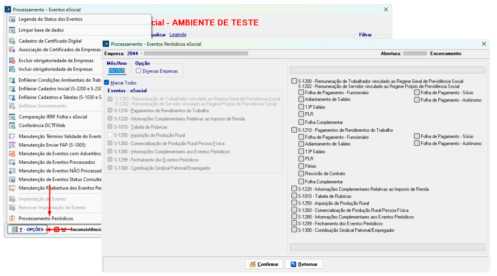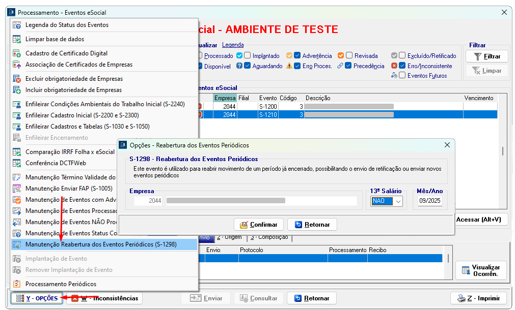 Opções → Manutenção Reabertura dos Eventos Periódicos (S-1298)