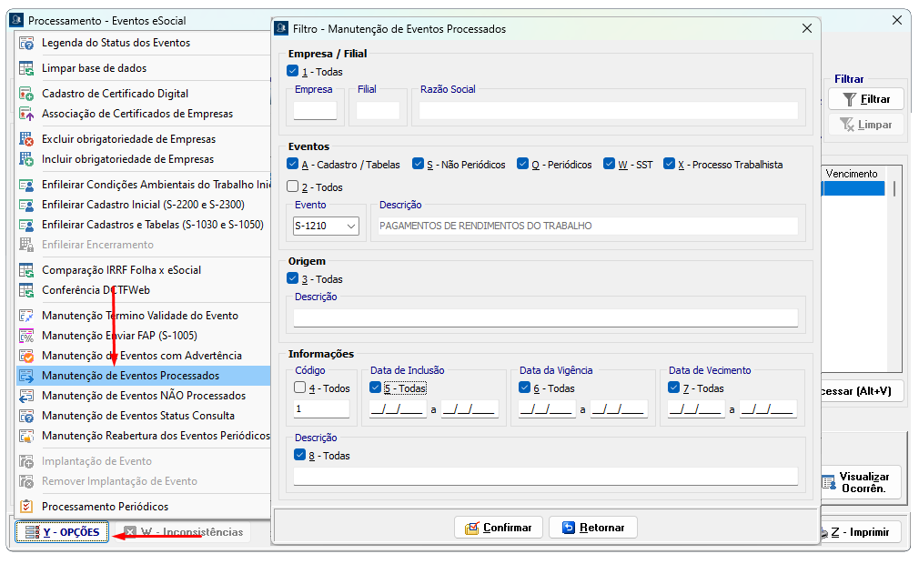 Opções → Manutenção de Eventos Processados