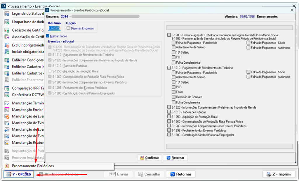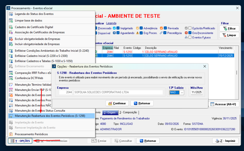 Opções → Manutenção Reabertura dos Eventos Periódicos (S-1298)