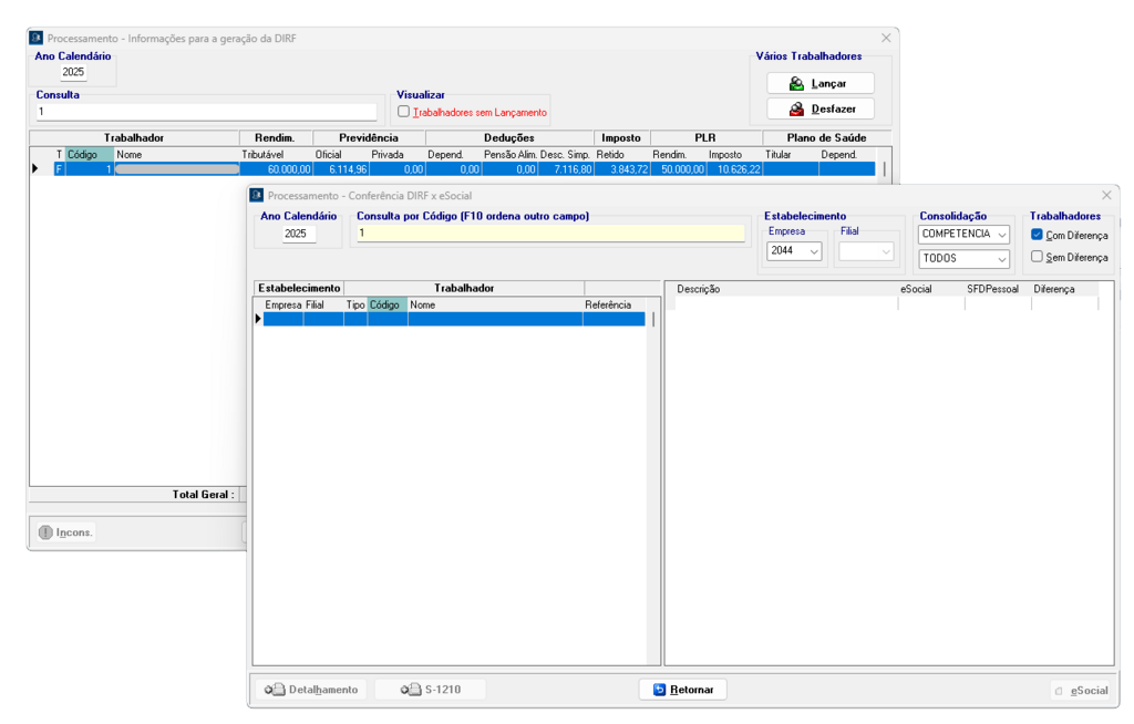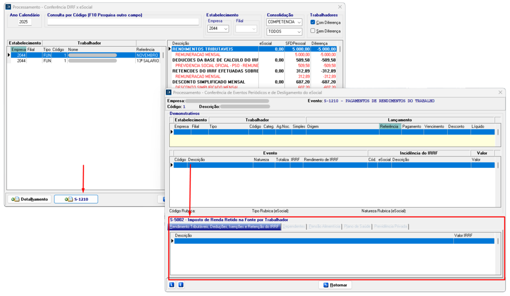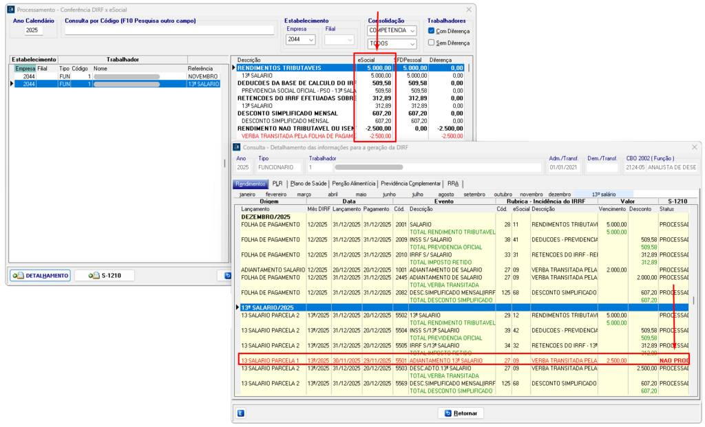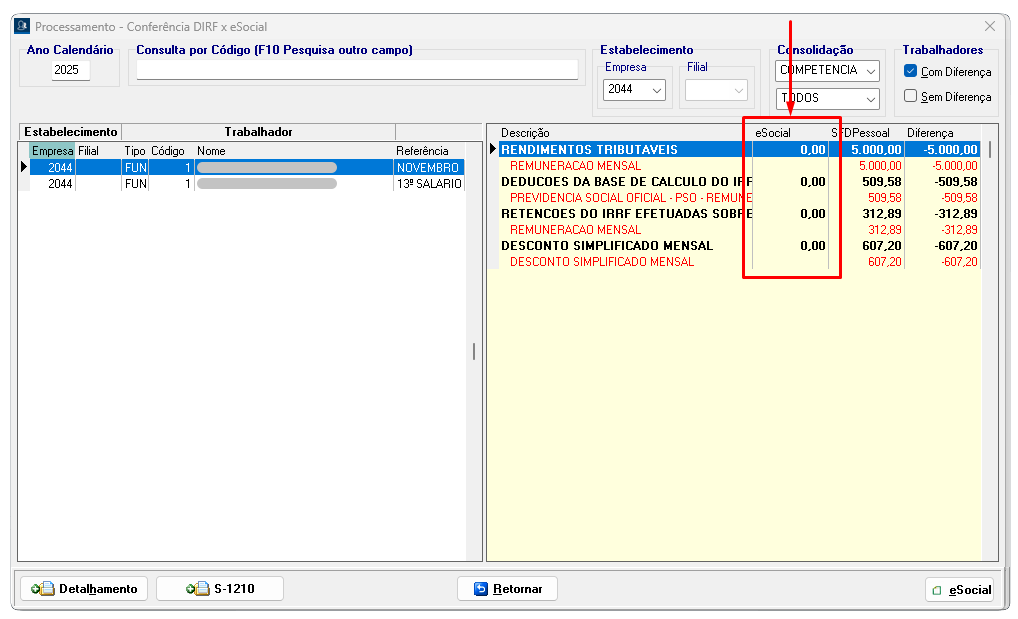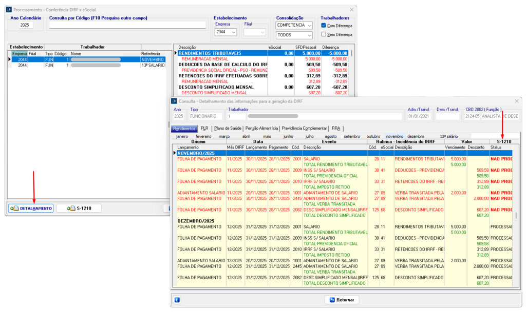 Processamento → Conferência DIRF x eSocial, clique no botão “Detalhamento”.