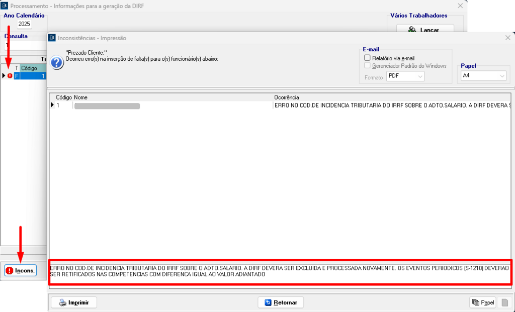 O sistema apresentará a seguinte mensagem na inconsistência da DIRF: