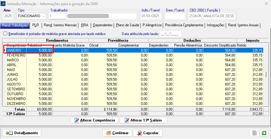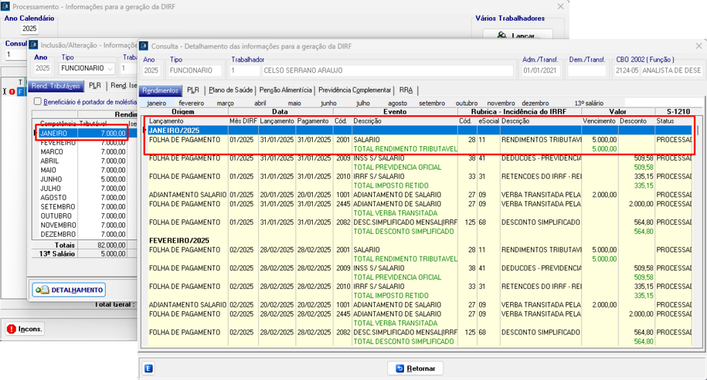 Exemplo: Na imagem abaixo, o Rendimento Tributável aparece como R$ 7.000,00, quando o correto seria R$ 5.000,00. 04_DIRFDetalhadaComErro.png85 KB