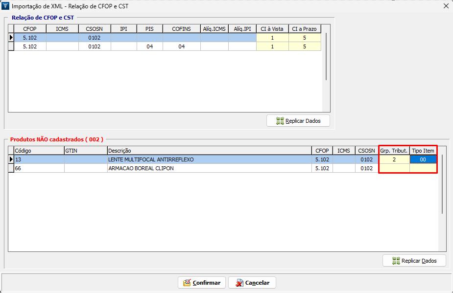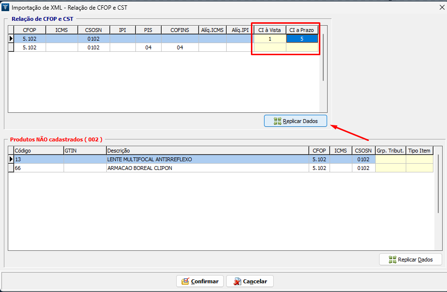 6. No alto da tela no quadro Relação de CFOP e CST, para cada CFOP tecle F9 e informe o C.I. à vista e a prazo. Neste quadro é possível utilizar a opção Replicar Dados (função disponível para o mesmo CFOP de origem);
