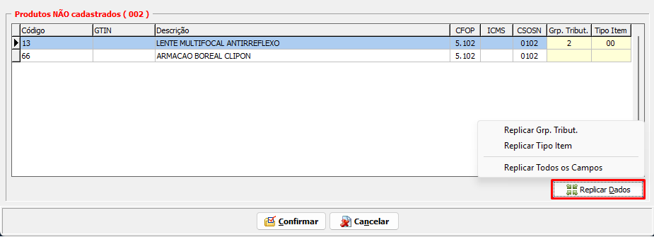 8. No rodapé da tela, ao lado direito, novamente a opção Replicar Dados poderá auxiliar nestas configurações. Para utilizá-la, selecione a linha que já foi cadastrada e replique na opção desejada (Todos campos, Tipo Item, Grupo);