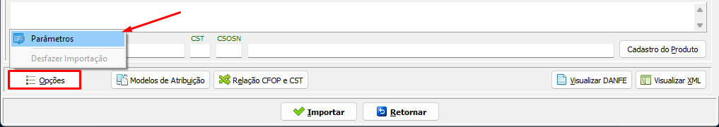 Observação: para o usuário que desejar e/ou necessitar realizar a importação das NF-e / NFC-e sem os produtos, na tela principal de importação no rodapé do lado esquerdo clique em Opções > Parâmetros. Informando SIM os produtos não serão importados.
