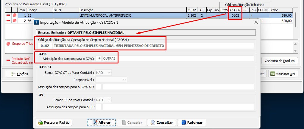 No exemplo abaixo, temos a empresa optante do Simples Nacional, sem valor de ICMS-ST e IPI na NF-e de origem.