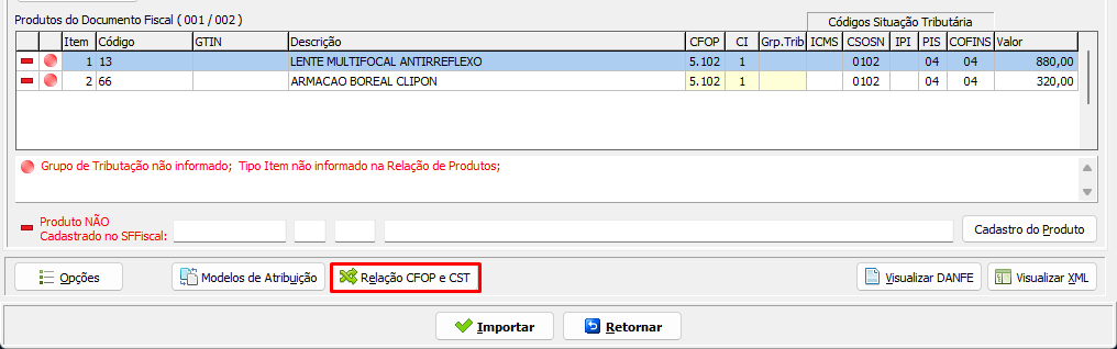 5. Após isso retorne a tela anterior e selecione no rodapé a opção Relação de CFOP e CST;
