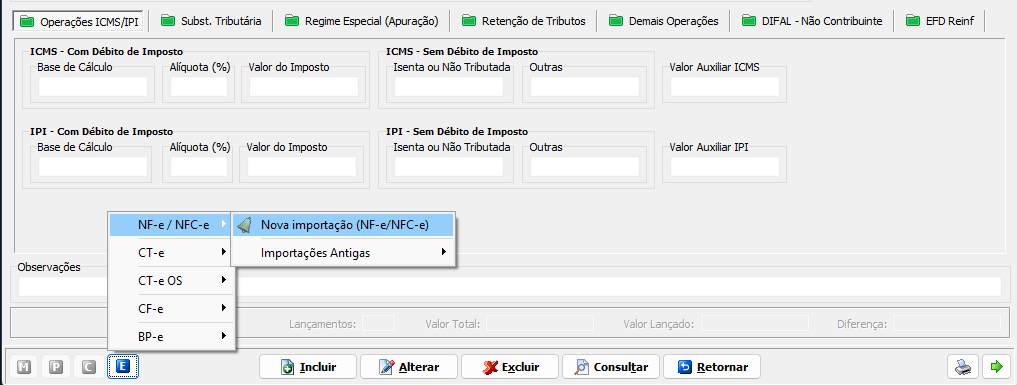 2. Ao lado esquerdo, no rodapé da tela, clique em E > NF-e/NFC-e > Nova Importação(NF-e/NFC-e);