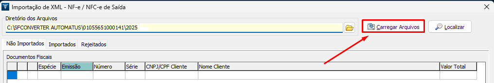 3. Em Diretório dos Arquivos indique a pasta onde o arquivo XML está salvo, clicando em Selecionar pasta, logo após clique em Carregar Arquivos;