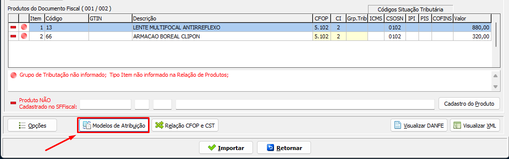 9. Confirme e retorne a tela principal. Caso ocorram erros, estes serão apresentados abaixo do Produto da Nota Fiscal em vermelho.