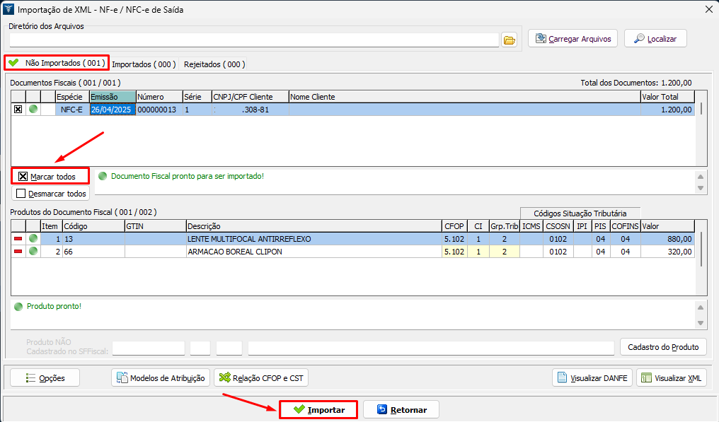 10. Sendo as notas apresentadas para a importação, clique na opção Marcar Todos ao lado esquerdo, e após no rodapé da tela na opção Importar;